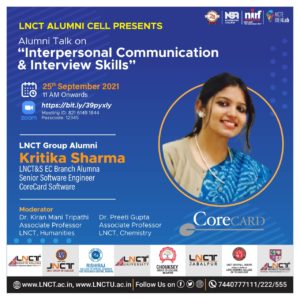 LNCT GROUP ALUMNI CELL Presents Alumni Talk on “Interpersonal Communication & Interview Skills” 25 Sept 2021 | 11.00 AM Onwards Join Via Zoom Link :