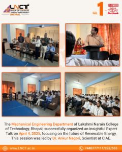 The Department of Mechanical Engineering, LNCT Bhopal, successfully organized an expert talk on April 4, 2025, focusing on the evolving landscape of renewable energy. The