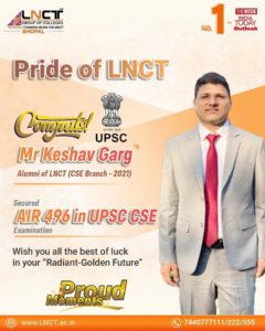 News A big congratulations to Mr. Keshav Garg, alumni of LNCT (CSE Branch – 2021) Pride of LNCT! A big congratulations to Mr. Keshav Garg, alumni of LNCT (CSE Branch – 2021), for securing AIR 496 in the UPSC CSE Read More » June 1, 2025