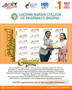 Kudos to Ms. Priyanjali Singh B.Pharm II Semester student at LNCP, Bhopal, for securing the Runner-Up position in the Oral Presentation at the MPCST-sponsored International
