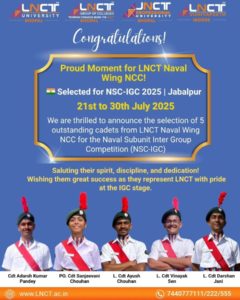 News Proud Moment for LNCT Naval Wing NCC A proud moment for LNCT Group of Colleges as five cadets from the Naval Wing NCC have been selected to represent at the prestigious NSC-IGC Read More » July 23, 2025