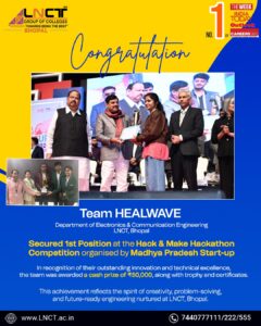 We are thrilled to share that Team HEALWAVE, representing the Department of Electronics & Communication Engineering, LNCT Bhopal, has secured 1st Position at the Hack