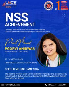 Congratulations to Poorvi Ahirwar, NSS Volunteer, for achieving state-level recognition at the State-Level NSS Leadership Training Camp 2026 in Chitrakoot, Satna (M.P.). Your commitment to