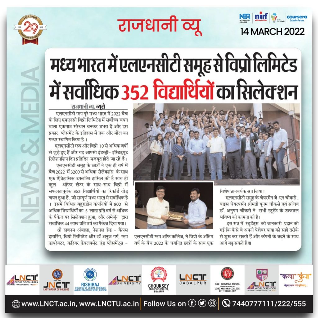 LNCT Group has created a new record in CAMPUS PLACEMENTS with 352 engineering students getting placed in Wipro Limited Highest in Central india