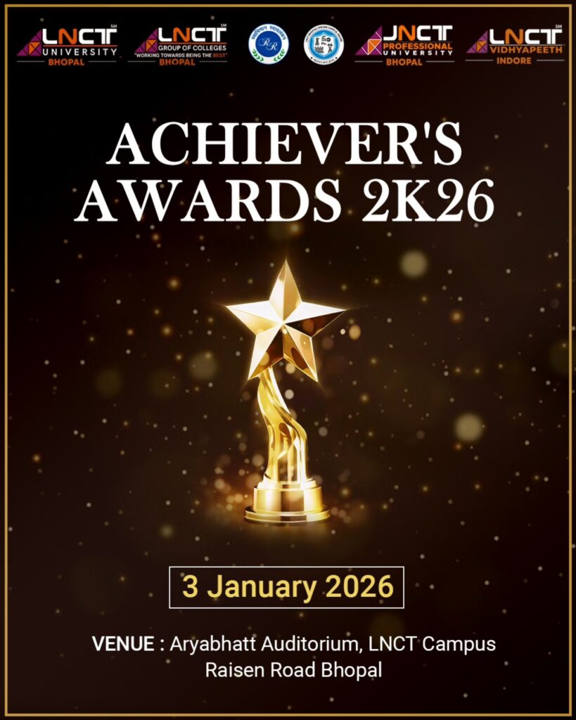 Celebrating excellence and remarkable success at Achiever’s Awards 2K26, where dedication meets recognition and talent sets new benchmarks, making it a proud and inspiring moment for achievers and mentors at Aryabhatt Auditorium, LNCT Group of Colleges Raisen Road Campus