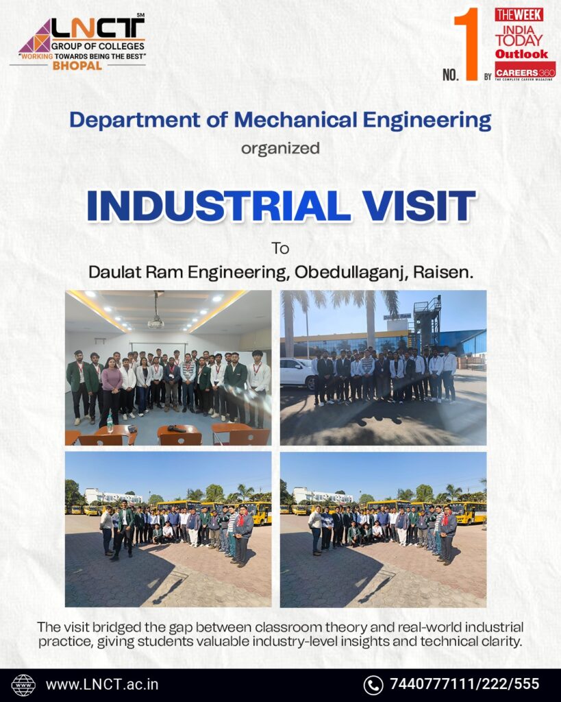 Department of Mechanical Engineering has conducted a Industrial visit at Daulat Ram Engineering, at Obedullaganj Raisen, Students have got the learnt the manufacturing of locomotive engines for railway and different components. They also learn design of Heat and Mass Transfer & Air and Refrigeration Design system.