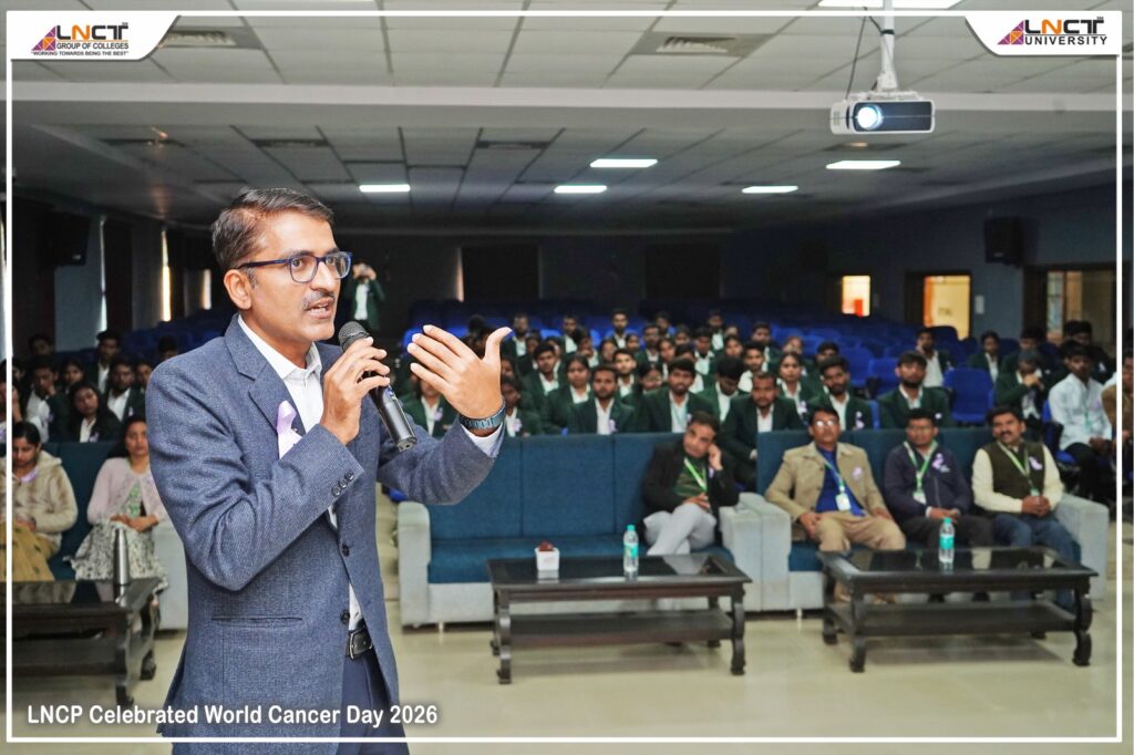 Lakshmi Narain College of Pharmacy (LNCP), Bhopal organized an expert talk on 04 Feb 2026 to Observe World Cancer Day to create awareness about cancer care and patient-centric treatment approaches. The session was delivered by Dr. Yogeshwar Shukla, Oncosurgeon, LN Medical , on the theme “United by Unique: Rewriting Treatment with People-Centered Care.” Dr. Shukla shared valuable insights on individualized cancer treatment, early diagnosis, and compassionate healthcare. Dr. Surendra Kumar Jain, Director, LNCP, welcomed the expert and appreciated his valuable contribution. The program was informative and inspired students and faculty toward holistic cancer care.