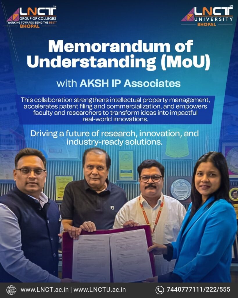 LNCT Group of Colleges/Universities has established a strategic Memorandum of Understanding (MoU) with AKSH IP Associates to strengthen its innovation ecosystem. This collaboration aims to enhance intellectual property management, facilitate patent filing and commercialization, and support faculty and researchers in translating scientific ideas into impactful innovations.