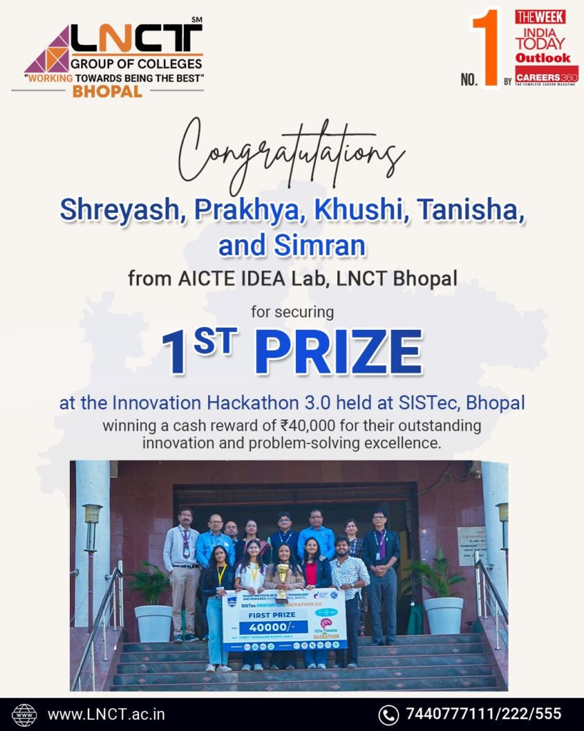 Our talented students — Shreyash, Prakhya, Khushi, Tanisha, and Simran from the AICTE IDEA Lab, LNCT Bhopal — have secured the 1st Prize at the Innovation Hackathon 3.0 held at SISTec, Bhopal, winning a cash prize of ₹40,000 for their outstanding innovative project.