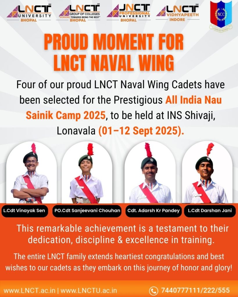 Four cadets of the LNCT Naval Wing have been selected to participate in the prestigious All India Nau Sainik Camp, to be held at INS Shivaji, Lonavla from 1st to 12th September 2025.