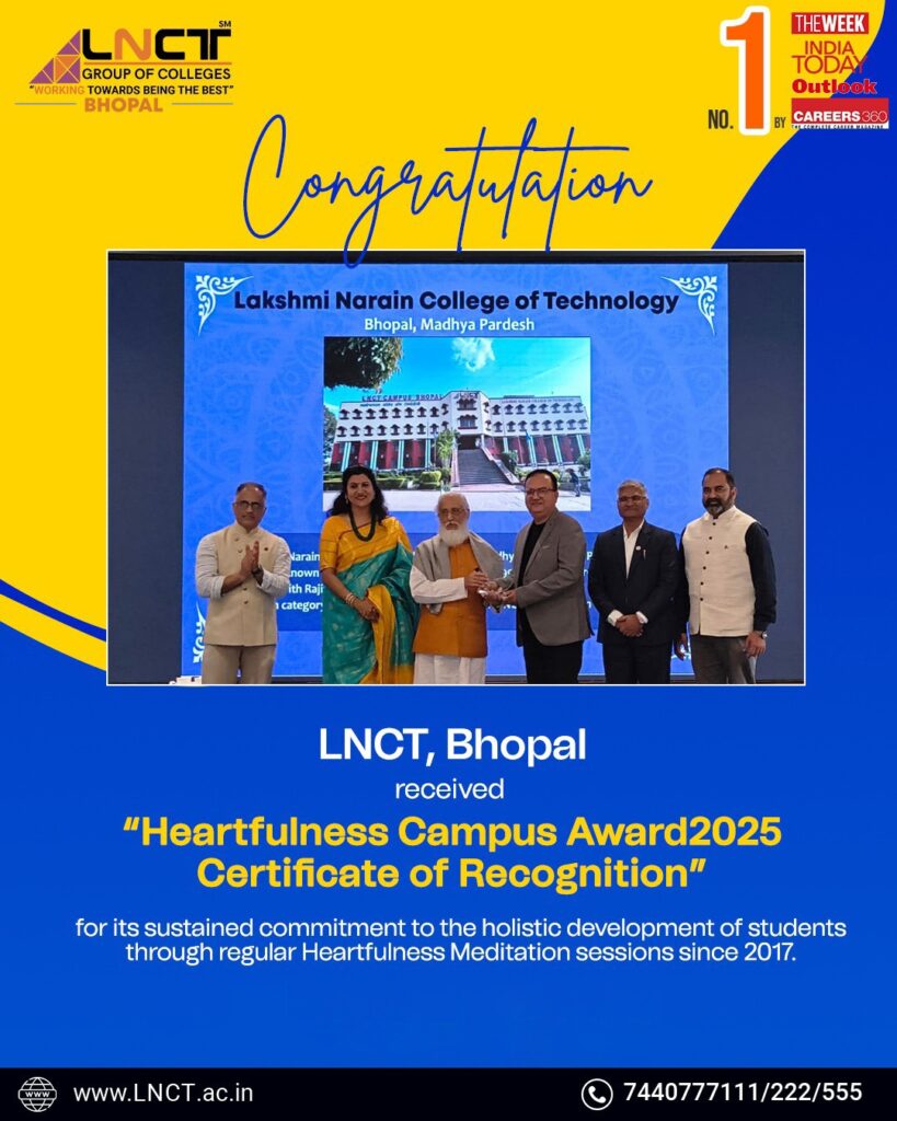 LNCT Group of Colleges, Bhopal has been honored with the “Heartfulness Campus Award 2025 – Certificate of Recognition.”