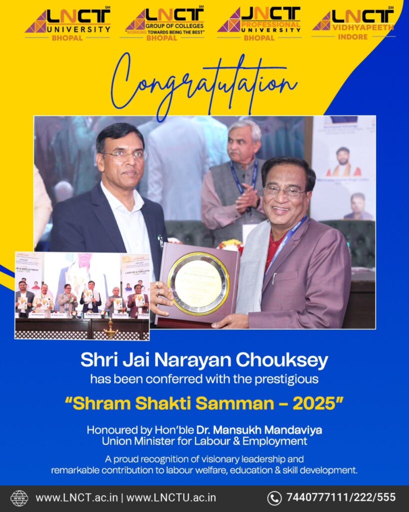 Shri Jai Narayan Chouksey, Chairman – LNCT Group & Chancellor, LNCT University, has been conferred with the prestigious “Shram Shakti Samman 2025” by Hon’ble Union Minister Dr. Mansukh Mandaviya, in recognition of his visionary leadership and outstanding contribution to labour welfare, education, and skill development.