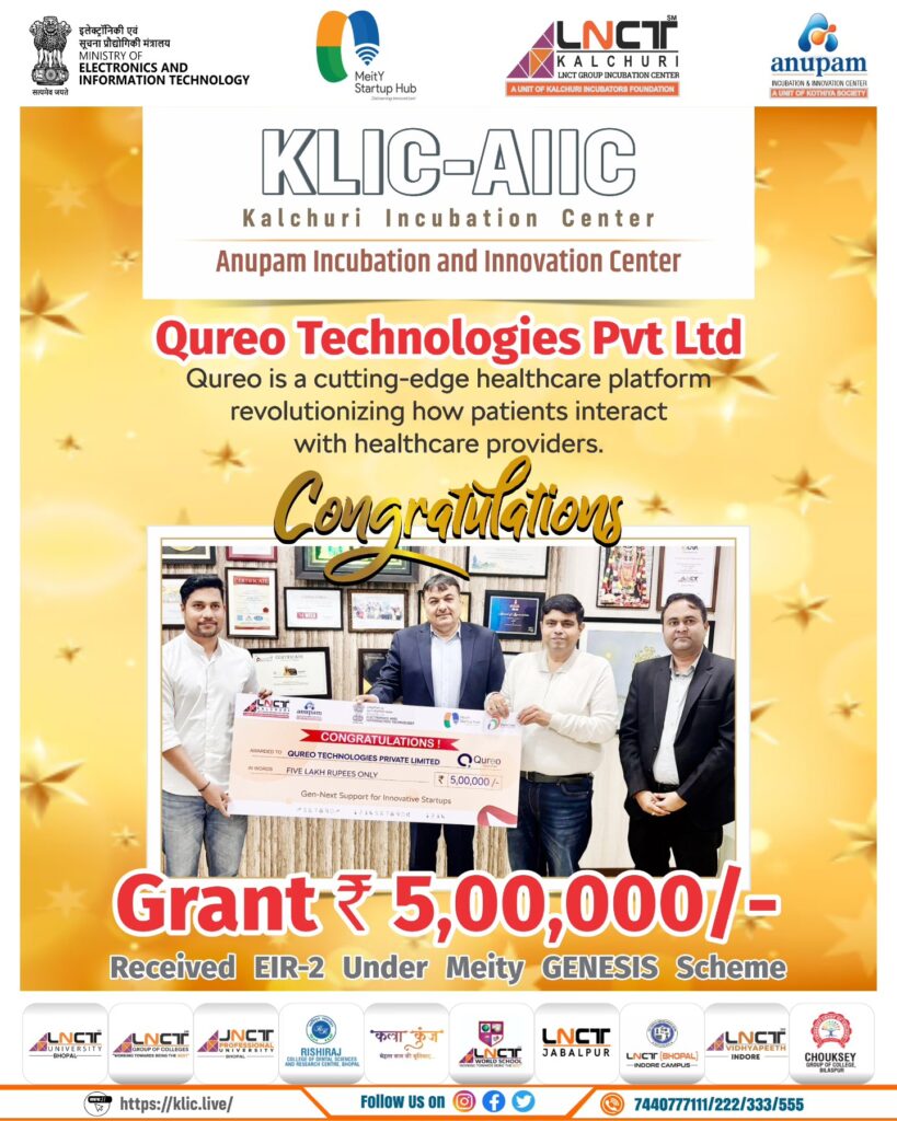 We are pleased to congratulate Qureo Technologies Private Limited on receiving a grant of ₹5,00,000/- under the Entrepreneur-in-Residence (EiR-2) program of the MeitY GENESIS Scheme.