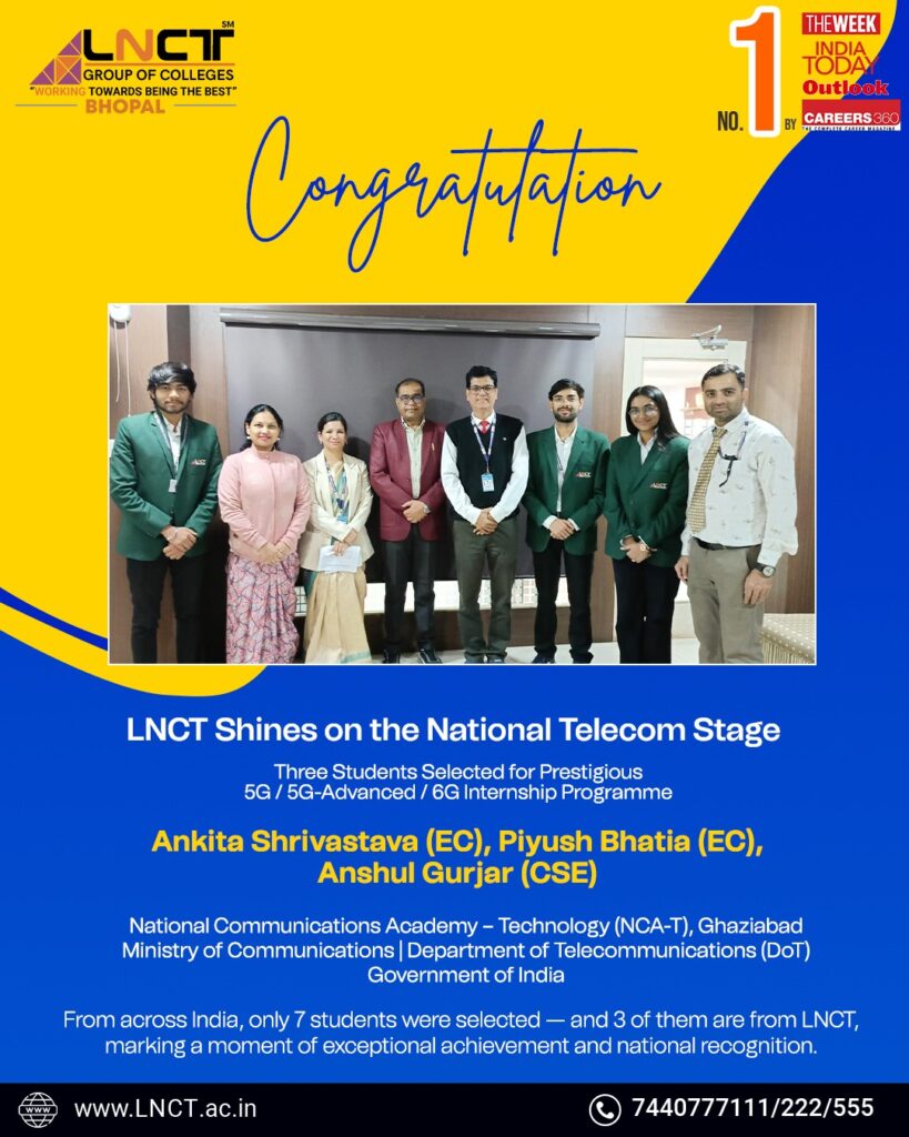 We are delighted to share that three students from LNCT — Ankita Shrivastava and Piyush Bhatia (EC), and Anshul Gurjar (CSE) — have been selected for a prestigious 6-week internship and advanced training programme on 5G / 5G-Advanced / 6G technologies at the National Communications Academy – Technology (NCA-T), Ghaziabad, under the Ministry of Communications, Department of Telecommunications (DoT), Government of India